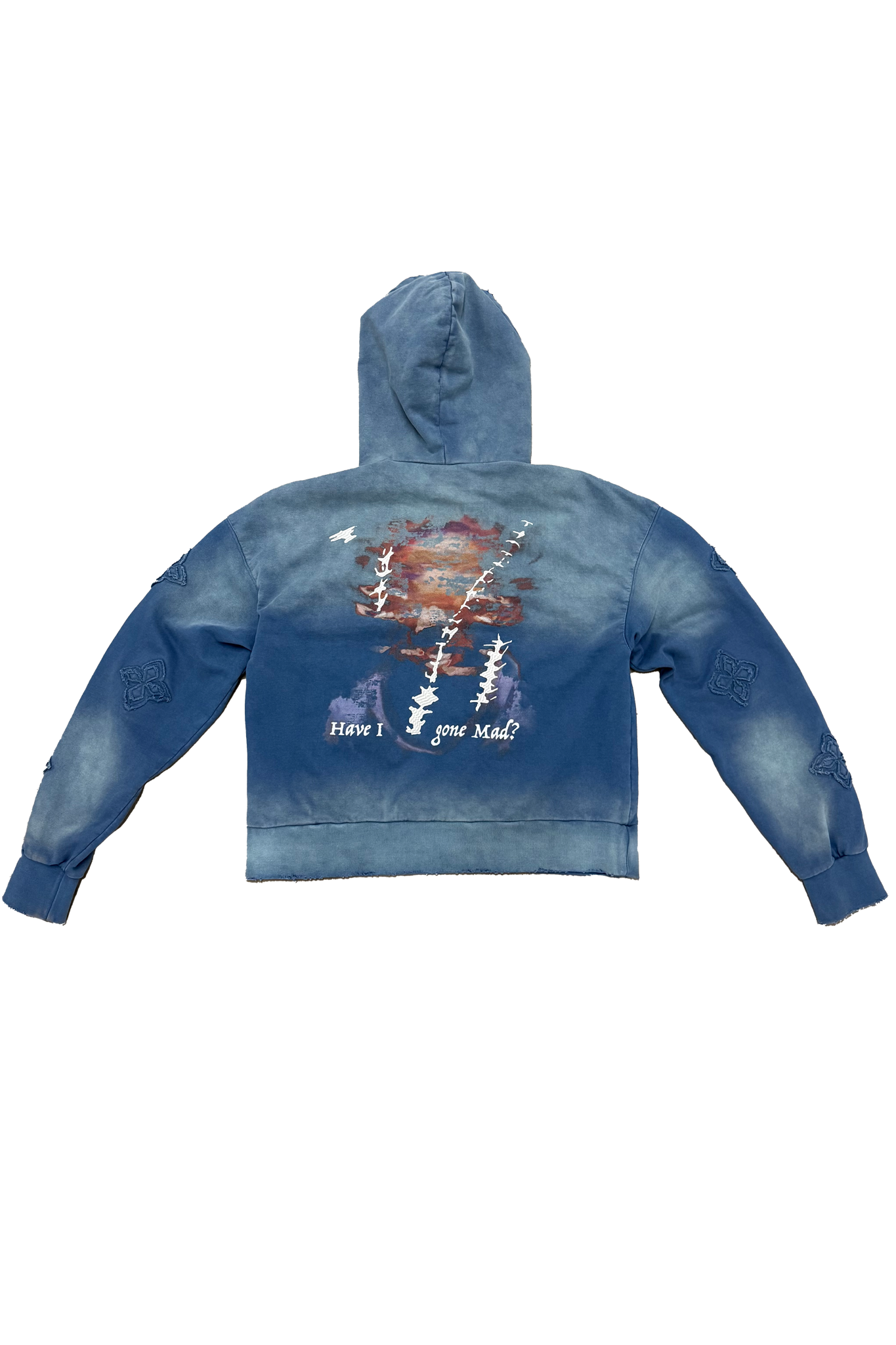 This 100% cotton hoodie is elevated with a sun-faded wash, creating a vintage-inspired aesthetic that feels both bold and timeless. The front features an embroidered "Madman" paired with intricately tethered patches on the sleeves. On the back, an abstract DTG-printed design delivers a striking visual statement, anchored by the phrase, "Have I gone Mad?" Crafted with meticulous attention to detail, this refined yet expressive piece is a perfect blend of casual wear and elevated artistry.